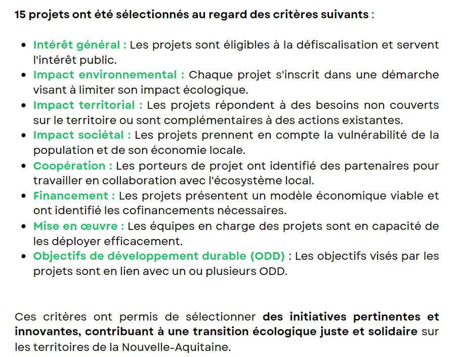 - Dans le respect de la justice sociale, les initiatives soutenues contribueront à la préservation de notre environnement et à une redynamisation de nos territoires.